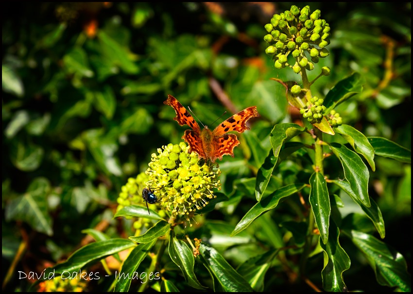 On a calm, warm, sunny day as this insects are out and about in search of energy giving nectar.  This Comma Butterfly shares the berries of the Ivy with a friendly Fly……