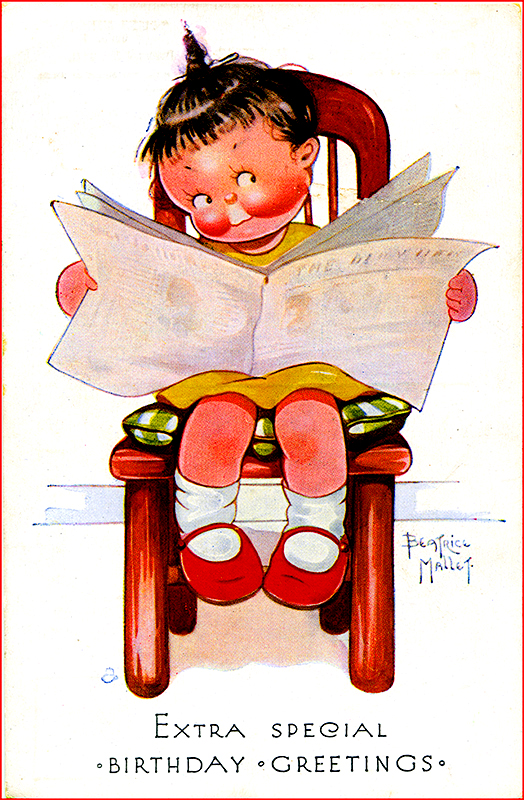 Whilst rummaging through those many saved items, I came across this distinctive card.  It is a Raphael Tuck Postcard and the Artist is Beatrice Mallet (1896-1951).  This is one of many illustrations commissioned by Tucks.  Often the same design would be used, with just a change to the greeting, making in suitable for different occasions.  I may be wrong but I think I also recall this image being used for a Valentine’s Day Card – possible the wording was along the lines of “I wonder if He is Thinking of Me”.
