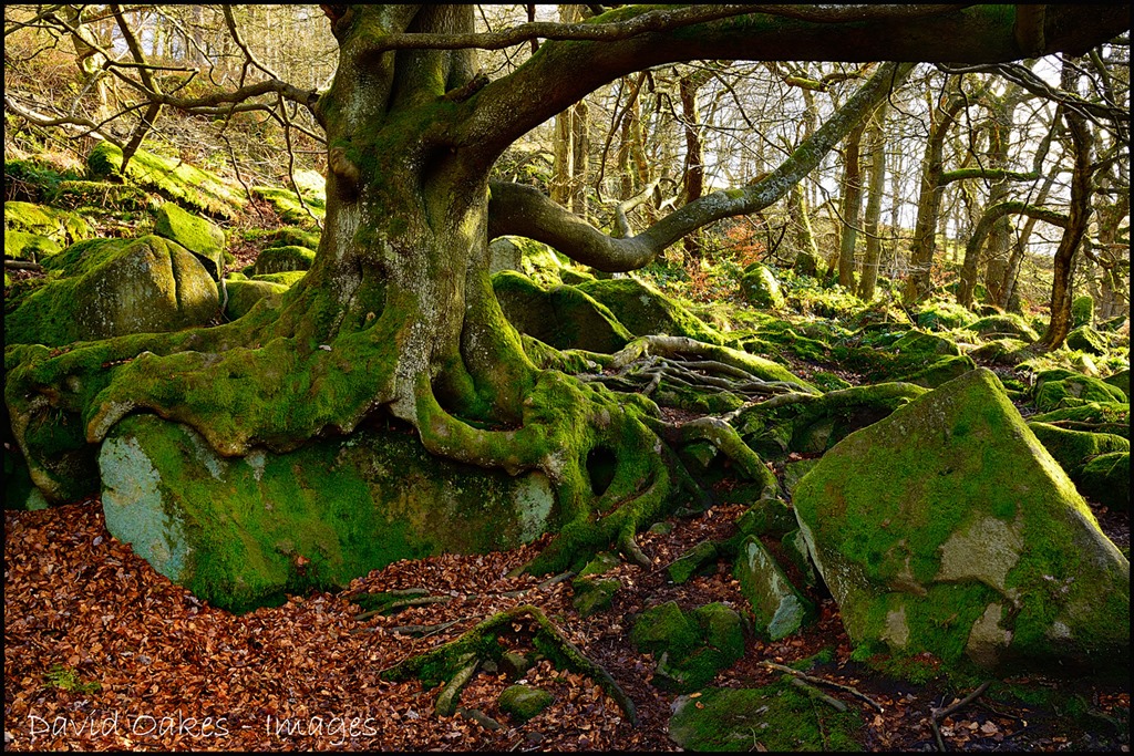 But it is those trees that are truly part of the natural landscape that have to impress the most. Take this Beech Tree as an example. It has to be over 100 years old, it was not planted by man but has grown from a seed that, by chance, became lodged in a crevice in this bolder field. No deep rich soil to sink its roots into for stability and nutrition. Instead its roots have had to claw there way over the gritstone rocks moulding to the very shape of the rock and digging deep into any crack to seek the vital water from the ground…….That’s Tenacity for you. Twisted as the roots are and tangled as many of its branches may be, the trunk is tall, stout and steady….to stand I hope for another 100 years.