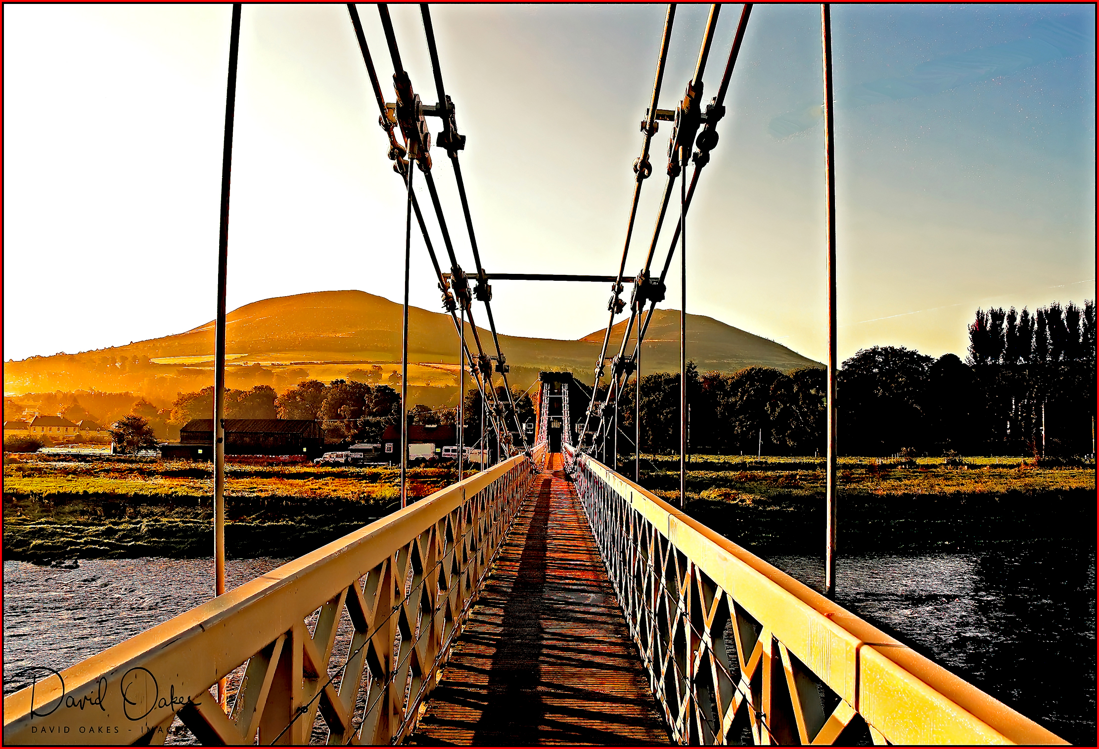 Location:- Dawn. The Chain Bridge over the River Tweed at Melrose, the Scottish Border Town that shelters beneath the Eildon Hills.