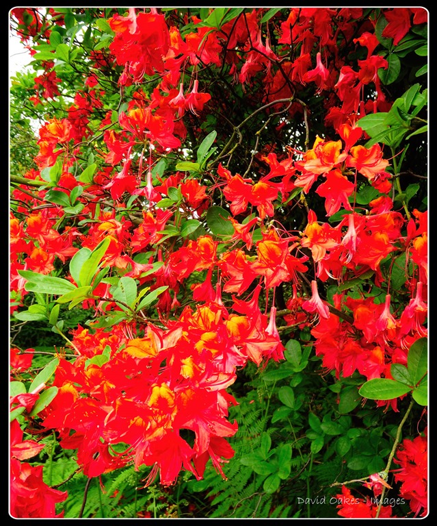 The last day of May and what a roller coaster of a month it has been for our flora. It started into growth so much earlier than is usual, then with temperatures dropping it slowed right down…..and in the last week it has just exploded into an abundance of growth. The Lilly pond now sports its first flowers with lots more buds just under the surface ready to push through. But May is leaving us on a rather dull day yet in this dark corner of the gardens one last Azalea is doing its best to bring a touch of sunshine…..positively glowing in its reds and oranges.